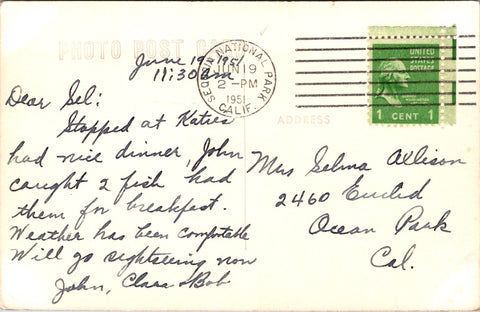 • mailed 1951 with a clear postmark for Sequoia National Park, Calif with 7 straight killer lines