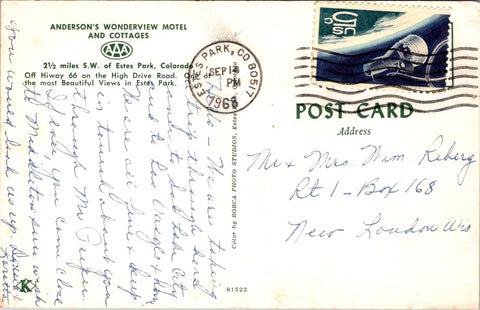 back: Andersons Wonderview Motel and Cottages 2 1/2 miles SW Love Estes Park, Colorado. Off highway 66 on the High Dr., Road. One of the most beautiful views in Estes Park