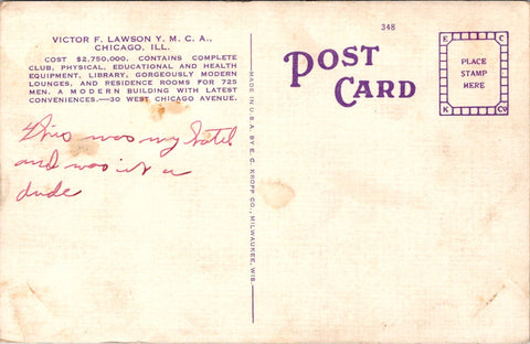 back: cost $2,750,000. Contains complete club, physical, educational and health equipment, liubrary, gorgeously modern lounges and residence rooms for 725 men. A modern building with latest conveniences - 30 West Chicago Ave