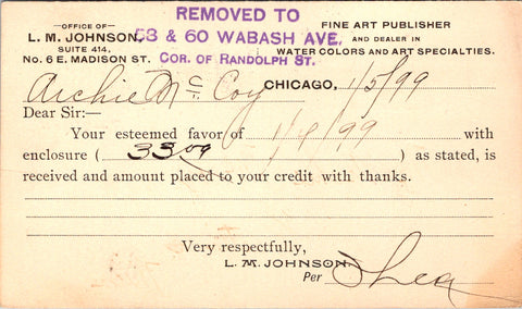 IL, CHICAGO - L M Johnson - Fine Art Publisher - Receipt - Postal Card - 2k0881