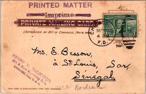 There is a stamp for Henry V Thornton - 304 N State St., Irving D.I.?? - Chicago, Ill., USA