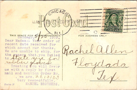 mailed 1909 Chicago with a large circle postmark that has the month and year on either side of the circle - with part of the 1909 in the 8 straight line killer lines - to Rachel Allen