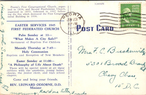 This is the same image as our B04269 but this card is unique in that printed under the information on the back of the card is depicted / Easter Services 1945 - First Federated Church / Palm Sunday at 11 - "What makes a city safe" sacrament of baptism for children / Maundy Thursday at 7:45 - Holy Communion 0 Baptism and Reception of New Members / Easter Sunday at 11:00 - "A philosophy of Life about Death" / There will be special music at all these services with the quartet, young ladies' choir, the junior choir, in high school singers. Come and bring your friends. Rev Leonard Odiorne, DD Minister