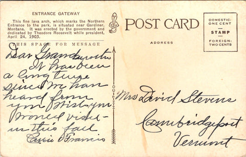 WY, YELLOWSTONE - Entrance Gateway, people in wagon up close, Yellowstone Park postcard - SL2115