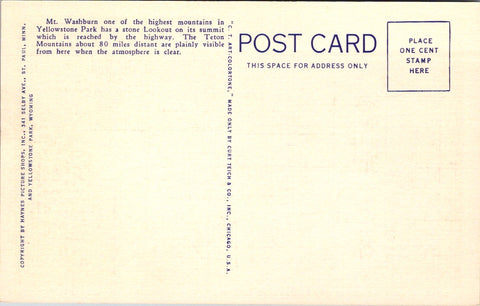- back: Mount Washburn one of the highest mountains in Yellowstone Park has a stone lookout on it summit which is reached by the highway. The Teton mountains about 80 miles distant plainly visible from here when the atmosphere is clear