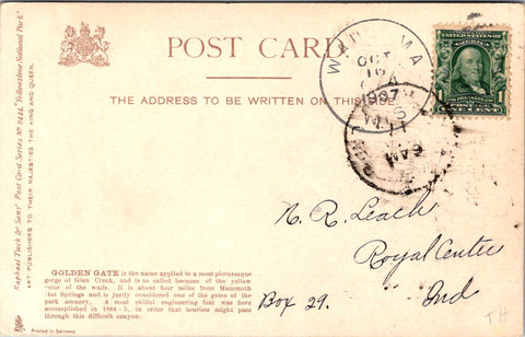 - Raphael Tuck & Sons' Post Card Series No 2444 Yellowstone National Park. Golden Gate is the name applied to a most picturesque gorge Glen Creek, and is so called because of the yellow color of the walls. It is about 4 miles from Mammoth Hot Springs it is justly considered one of the gems of the park scenery. A most skilful (as spelled on card) engineering feat was here accomplished in 1884–5, in order that tourist might pass through this difficult canyon.