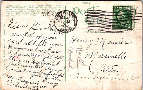 • back:  Monroe Avenue is Detroits's Great Amusement Thoroughfare.  Here are located the Temple, Family, Columbia Royale and National Theatres, also any number of Nickel Shows.  The electric display at night is very brilliant and here we _____ the crowd in the evening.