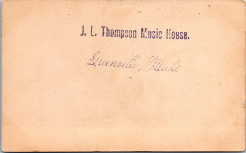- not posted as it really isn't a postcard. This is an advertisement for the Everett Piano - showing a lady playing the piano and another lady in a long dress possibly singing. The back has the following stamped on it: J L Thompson Music House - Greenville, Mich