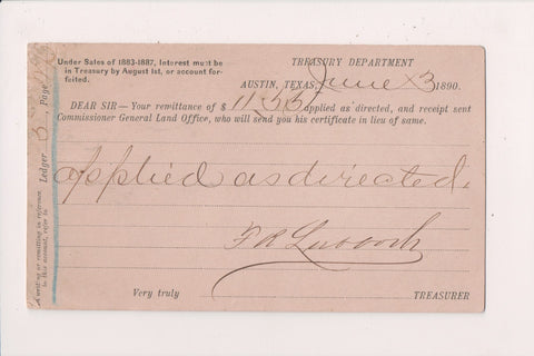 TX, AUSTIN - Treasury Department, F R Lubbock Treasurer - 1890 Postal Card - C17135