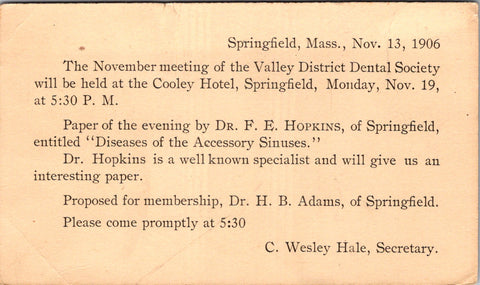 back dated 1906 references the November meeting of the Valley District Dental Society will be held at the Cooley Hotel, Springfield, Monday, Nov 19, at 5:30pm. Paper of the evening by Dr F E Hopkins, of Springfield, entitled DISEASES OF THE ACCESSORY SINUSES. Dr Hopkins is a well known specialist and will give us an interesting paper. Proposed for membership, Dr H B Adams of Springfield. Please come promptly at 5:30. C Wesley Hale, Secretary