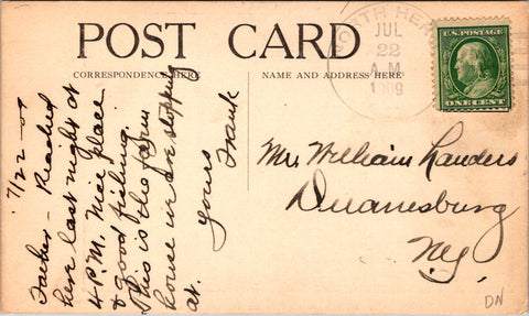 note states:  Father reached here last night at 4pm.  Nice place and good fishing.  This is the farm house we are stopping at.  And on the front:  We are 16 miles from Rouses Pt on the Rutland RR
