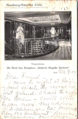 • titled:  Treppenhaus (staircase) An Bord des Dampfers Kaiserin Auguste Victoria  & showing the ornate interior of the vessel