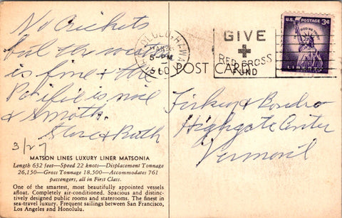 Ship Postcard - MATSONIA close up with Stats - 1960 postcard - 500175